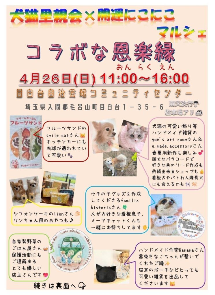 【イベント参加のお知らせ】猫丸市場ぷらすわんが4月イベントにお邪魔させて頂きます!里親会はもちろんキッチンカーや作家さん達も大集合️是非遊びにいらしてください!詳細はインスタをご覧ください。4月26日日曜日11時〜16時埼玉県入間郡毛呂山町目白台1-35-6目白台自治会館コミュニティセンター